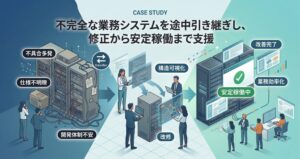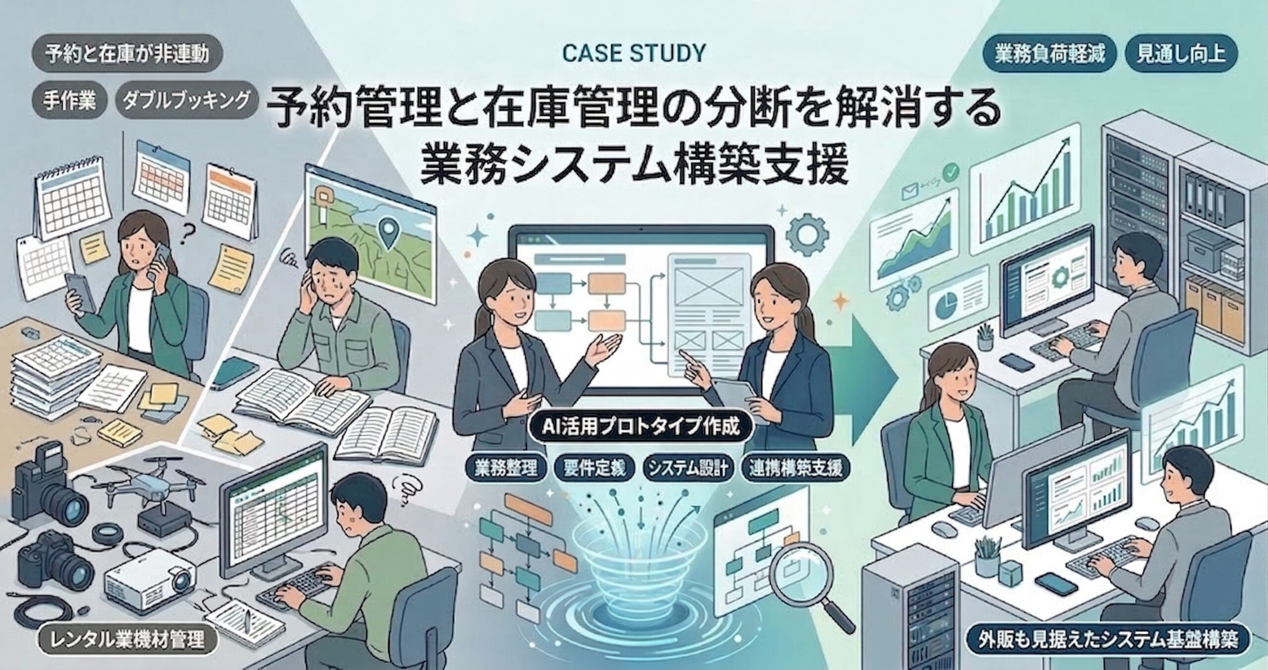 予約情報と在庫情報が別々に管理されていた業務に対して、 現場の運用を整理しながら必要な要件を明確化し、 予約と在庫を連動して管理しやすい仕組みづくりを支援した事例です。 また、将来的に同業他社へのシステム提供も視野に入れた設計を行い、 業務改善だけでなく事業展開にもつながるシステム構築を支援しました。